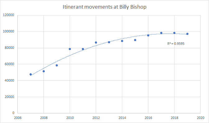 Itinerant movements at Billy Bishop have also flattened out since 2014; as the dominant commercial operator at the airport, Porter’s activities likely influence this trend heavily.